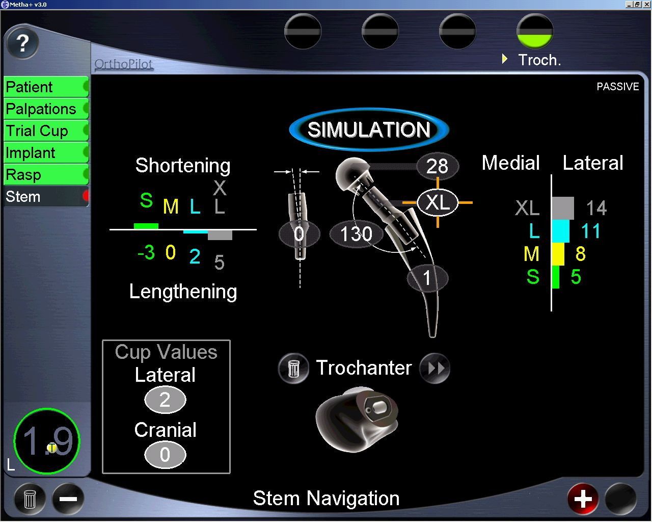 Durante la fase di navigazione vera e proprio il computer fornirà al chirurgo dati visivi e numerici del suo operato. Tutto ciò viene visualizzato sullo schermo del computer, rendendo ben visibili al chirurgo, zone normalmente inaccessibili del campo operatorio. Sullo schermo sono visualizzate anche misurazioni di distanze ed angoli, in tempo reale. È possibile, in alcuni navigatori, ottenere un report di quanto accaduto durante la procedura navigata e del posizionamento finale della protesi.Ma sono veramente necessari i navigatori in una chirurgia di routine come una protesi dell’anca ? Quanto sono accurati i navigatori e quali sono le loro problematiche in chirurgia protesica dell’anca ? Un divertente studio di Ala et al mostra chiaramente come i chirurghi ortopedici, anche se esperti, non sempre abbiano una percezione precisa di come stiano impiantando una componente acetabolare. In questo studio in cui veniva chiesto al chirurgo di quantificare i gradi di orientamento della protesi appena eseguita, viene mostrato come, dopo un riscontro TAC post operatorio, l’errore tra presunzione e realtà del posizionamento raggiungeva valori enormi. Quindi la necessità di un navigatore non è poi così remota. Se poi, aggiungiamo la serie di informazioni, riguardanti la lunghezza dell’arto, l’off set, il range di movimento, l’impingement delle componenti, sia di prova che definitive, il quadro diventa molto interessante. Non basta, l’avvento delle protesi d’anca totale a minima invasività (THR), la conservazione del collo, il risparmio osseo dell’acetabolo, la cosiddetta Tissue Sparing Surgery, con le teste di grande diametro, hanno ristretto lo spazio articolare. Tanto togli, tanto metti, così è sempre più facile incorrere nella complicanza dell’allungamento dell’arto e sempre più importante conoscere quant’è lo spazio. Cosa che il computer ti fornisce, tramite un diodo infisso nell’acetabolo ed uno sul femore. Uno dei motivi di questo cambiamento è dovuto al più frequente uso di protesi articolari nei pazienti giovani e attivi. In questo gruppo di soggetti preservare il bone-stock diventa più importante in quanto la possibilità di una procedura di revisione è aumentata, in considerazione dell’età.Recentemente, nuovi modelli di steli modulari con la preservazione del collo femorale sono disponibili sul mercato, con i primi risultati positivi. La modularità dello stelo e la tecnologia della navigazione sono un matrimonio felice, per questi pazienti. La tecnica computer assistita aiuta il chirurgo a scegliere il miglior posizionamento del collo per ottenere il miglior arco di movimento (ROM), la giusta tensione muscolare (off set), la corretta metria degli arti con il giusto centro di rotazione. Del resto, la dismetria conseguente alla protesi d’anca può essere un problema significativo e ha dimostrato di contribuire all’insoddisfazione dei pazienti. Dolore, instabilità, rigidità, neuropatia, ossificazione eterotopica sono tutti descritti come una diretta o indiretta conseguenza della dismetria degli arti ed errato off-set femorale. Studi in letteratura dimostrano un miglioramento, statisticamente significativo, nella precisione di posizionamento della coppa acetabolare, utilizzando la navigazione, rispetto a quello tradizionale. Tuttavia, pochi studi hanno pubblicato dei risultati sul posizionamento dello stelo femorale, utilizzando la navigazione computer assistita e nessuna valutazione dell’effetto della navigazione sulla dismetria degli arti