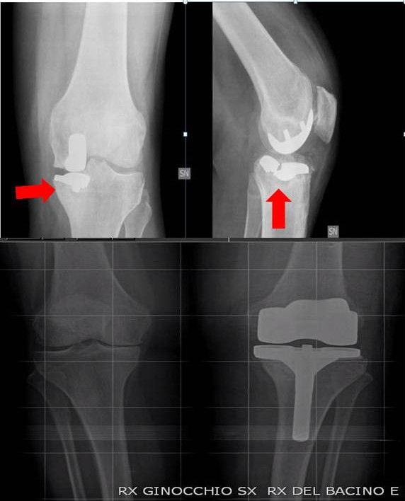 Nel gruppo A, l’intervento di revisione è stato eseguito utilizzando nuovamente una UKR in 2 casi, una Bi-UKR in 1 caso, a protesi totale a risparmio del crociato (CR) in 7 casi e una protesi totale postero stabilizzata (PS) in 12 casi. Nel gruppo B invece, l’intervento di revisione è stato eseguito utilizzando una CR TKR in 5 casi, una PS TKR in 14 casi e una CCK TKR in 3 casi. Abbiamo utilizzato un augmentation in metallo di 4 mm in 3 casi nel gruppo A, mentre nel gruppo B abbiamo utlizzato 5 augmentation in metallo di 4 mm e 1 da 8 mm. Inoltre in 2 casi nel gruppo B è stato utilizzato osso di banca. Nel gruppo A sono stati utilizzati due steli tibiali non cementati da 80 mm, mentre nel gruppo B sono stati utilizzati 2 steli tibiali non cementati da 80 mm e 3 da 120 mm.