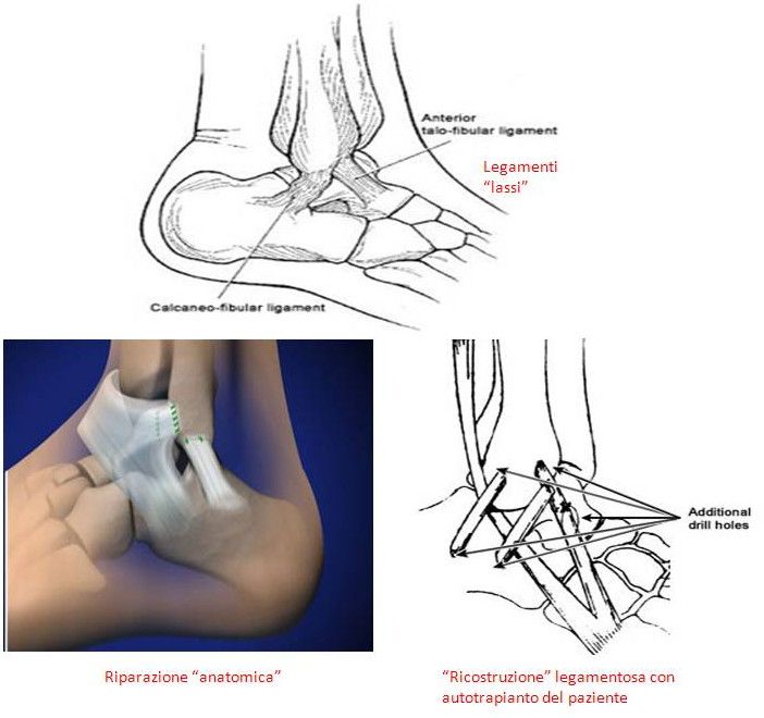 Il trattamento chirurgico: Negli anni passati è stato dato grande valore alla artroscopia che però ha visto progressivamente restringere le sue indicazioni solo nei casi in cui è necessario eseguire preventivamente una pulizia dei residui legamentosi o dove è possibile eseguire uno “skrinkage” (plicatura termica) dei residui legamentosi. Fondamentalmente sono descritti 2 tipi di tecniche chirurgiche di riparazione dell’apparato capsulo legamentoso lesionato e sintomatico per l’instabilità. La prima tecnica è basata su di una ricostruzione anatomica effettuando semplicemente una ritenzione o sutura dei legamenti lesionati o lassi, nota anche come procedura Broström. Essa può anche avvalersi dell’utilizzo di ancorette o viti che consento di ritensionare o reinserire i tendini lesionati. Il secondo tipo di tecnica chirurgica prevede una vera e propria ricostruzione dell’apparato legamentoso attraverso l’uso di un tendine o di una sua porzione, in genere il peroneo breve, dello stesso paziente. Esso viene prelevato a livello posteriore del malleolo esterno ed utilizzato durante lo stesso atto chirurgico ed ,attraverso dei tunnel ossei, è utilizzato per ricreare un nuovo apparato stabilizzatore della caviglia. Le indicazione per questa metodica, indubbiamente più invasiva sono in casi più cronici, in cui l’assenza di qualsiasi residuo legamentoso rende impensabile una qualsiasi sutura dei legamenti. I risultati di questa metodica sono indiscutibilmente ottimi per quanto riguarda la stabilità ma espongono il paziente al rischio di maggiori rigidità alla flesso-estensione, irritazioni nervose ed ovviamente a cicatrici più estese. Infine è necessario ricordare anche la possibilità di ricorrere ad allograft ossia tendini da cadavere prelevati da apposite banche di tessuto.